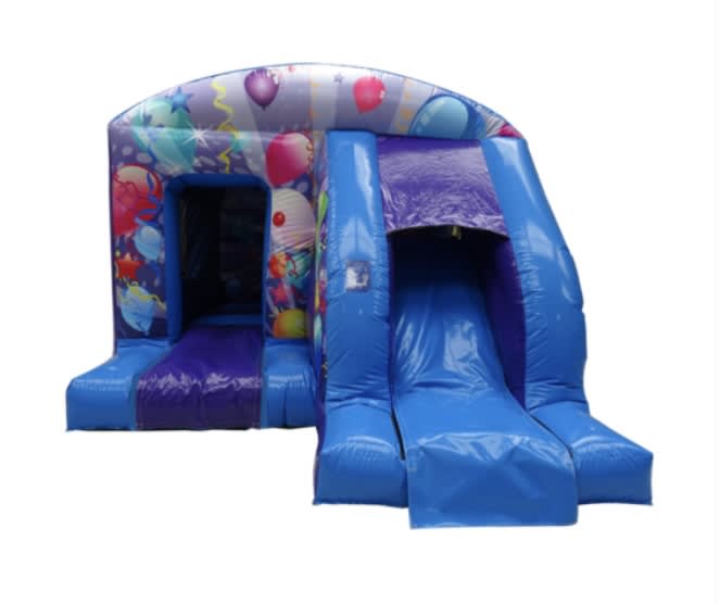 Hire Purple & Blue Box Jump and Slide. With its Climb and Slide exit at the front enables this inflatable to be used in a higher proportion of back gardens than a side slide equivalent. Vibrant blue and purple in colour with balloons galore and eye catching digital artwork. The side walls are see through so you can capture all the fun. A perfect choice for all parties and events.