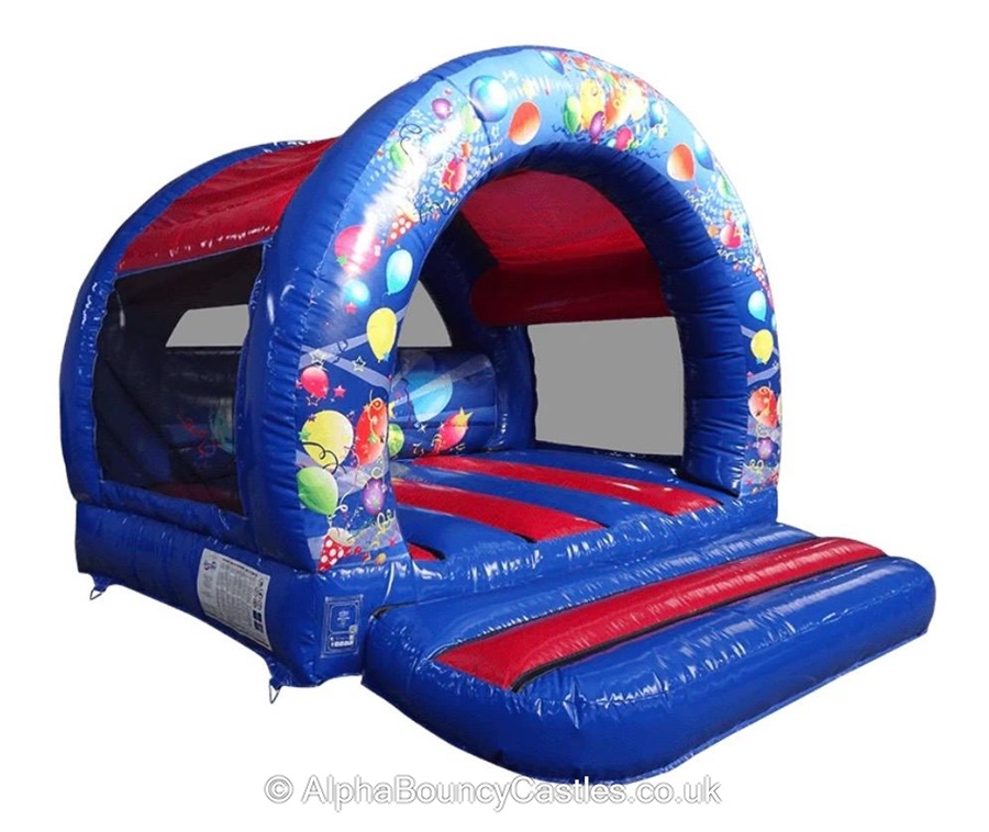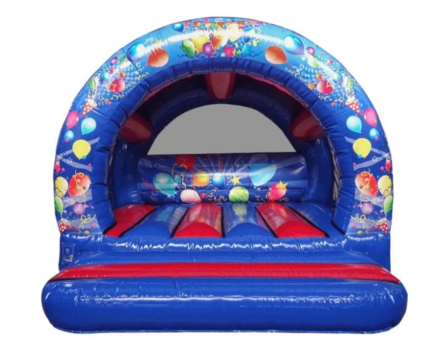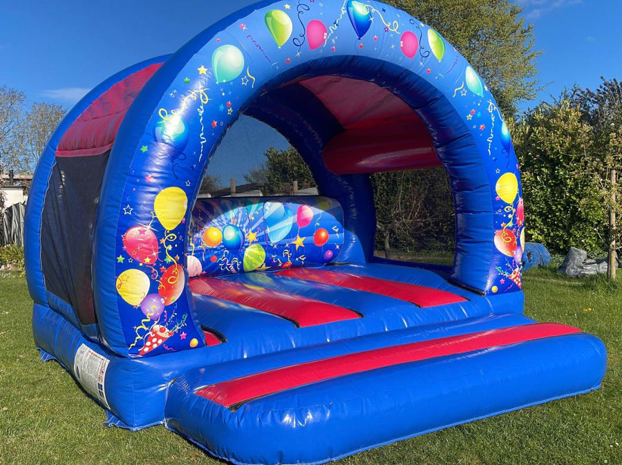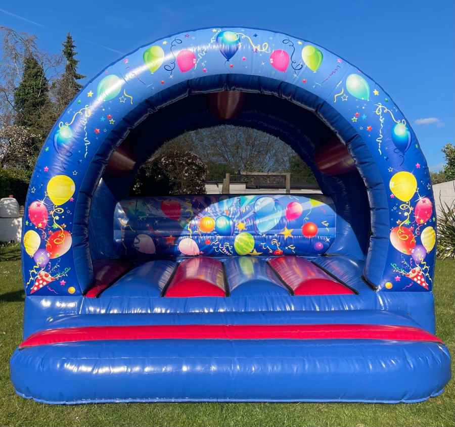 Styled in bright red and blue with fun balloon and celebration artwork, this inflatable creates a lively party atmosphere. It features a spacious bouncing area, high side walls for added safety, and a large open front so adults can easily supervise.