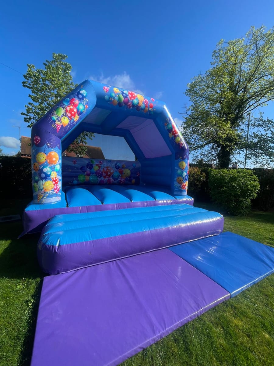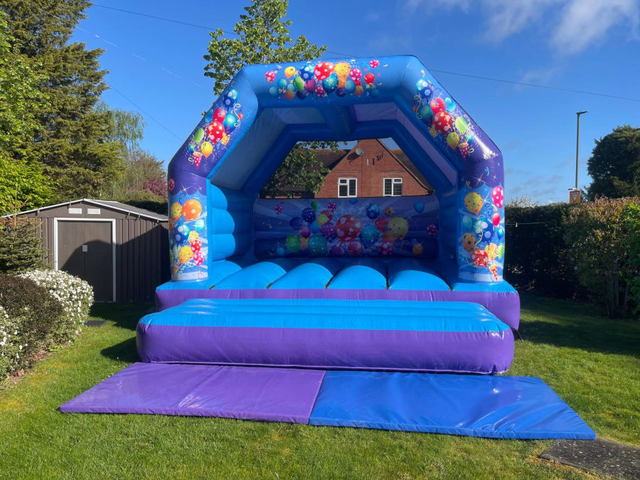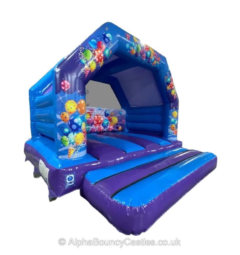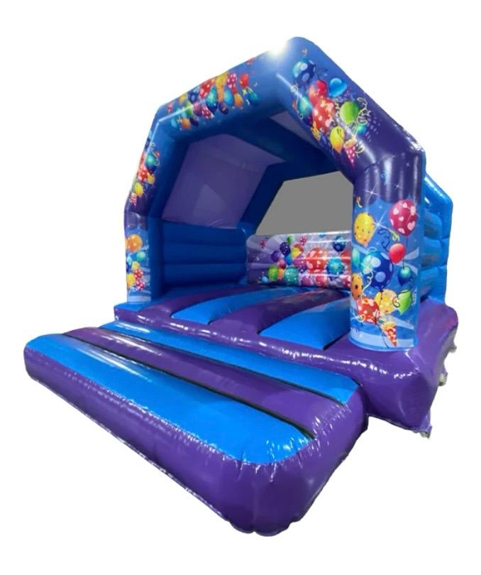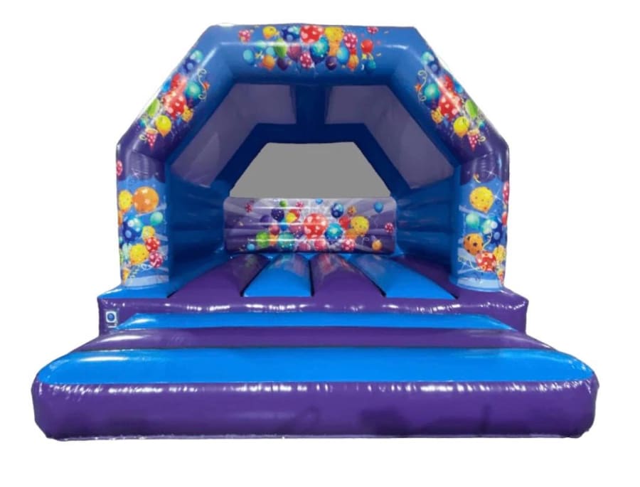 Featuring vibrant blue and purple colours with fun balloon and celebration artwork, this inflatable instantly creates a lively party atmosphere. Inside, there’s a large bouncing area, high side walls for added safety, and an open front design so adults can easily supervise.